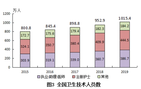 2019年末衛(wèi)生人員總數(shù)中,衛(wèi)生技術(shù)人員1015.4萬(wàn)人,鄉(xiāng)村醫(yī)生和衛(wèi)生員84.2萬(wàn)人,其他技術(shù)人員50.4萬(wàn)人,管理人員54.4萬(wàn)人,工勤技能人員88.4萬(wàn)人。衛(wèi)生技術(shù)人員中,執(zhí)業(yè)(助理)醫(yī)師386.7萬(wàn)人,注冊(cè)護(hù)士444.5萬(wàn)人。與上年比較,衛(wèi)生技術(shù)人員增加62.5萬(wàn)人(增長(zhǎng)6.6%)(見(jiàn)表2)。
