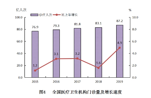 (一)門(mén)診和住院量。2019年,全國(guó)醫(yī)療衛(wèi)生機(jī)構(gòu)總診療人次達(dá)87.2億人次,比上年增加4.1億人次(增長(zhǎng)4.9%)。2019年居民到醫(yī)療衛(wèi)生機(jī)構(gòu)平均就診6.2次。